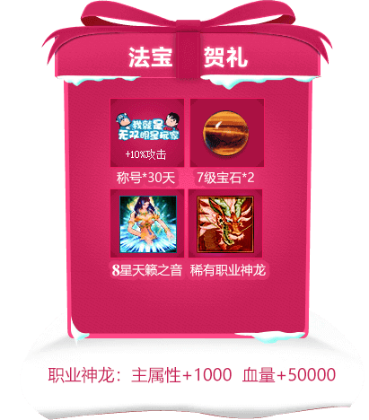 1、贺礼活动:2026年2月10日-2026年2月28日,充值累积总额达1元可领1元贺礼;99元可领精致贺礼;888元可领奢华贺礼;更有神器法宝震撼来袭。